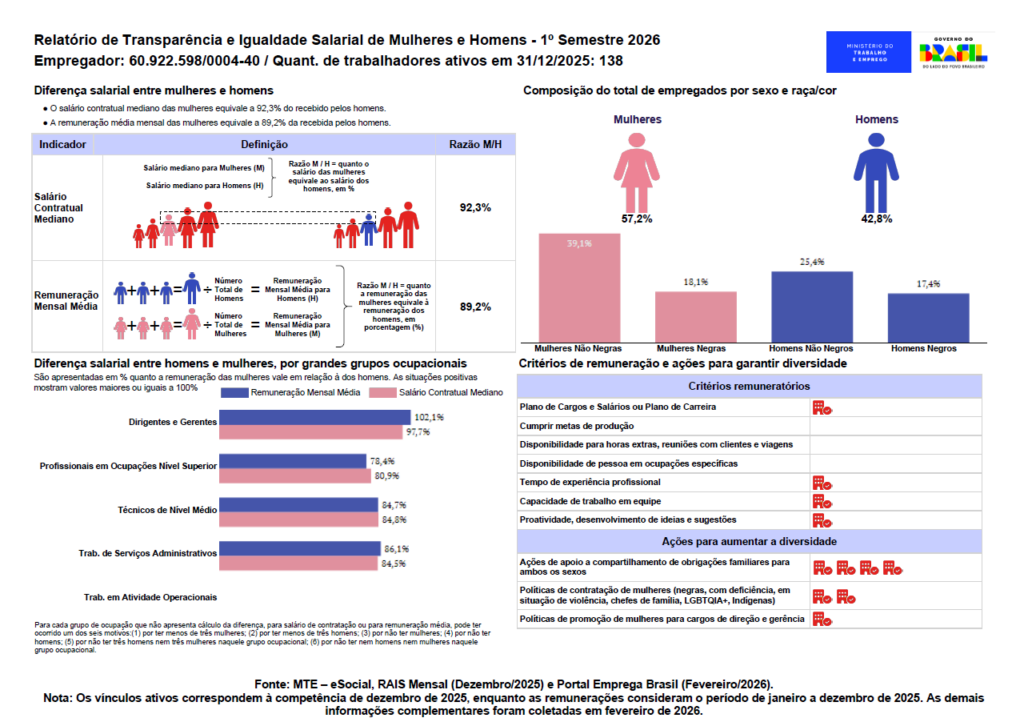 Os indicadores de remuneração aqui apresentados têm como objetivo garantir transparência e permitir o acompanhamento pela sociedade e pelos colaboradores. A empresa mantém programas e ações contínuas de desenvolvimento profissional, equidade e inclusão, buscando eliminar eventuais desigualdades e promover um ambiente de trabalho justo e igualitário.